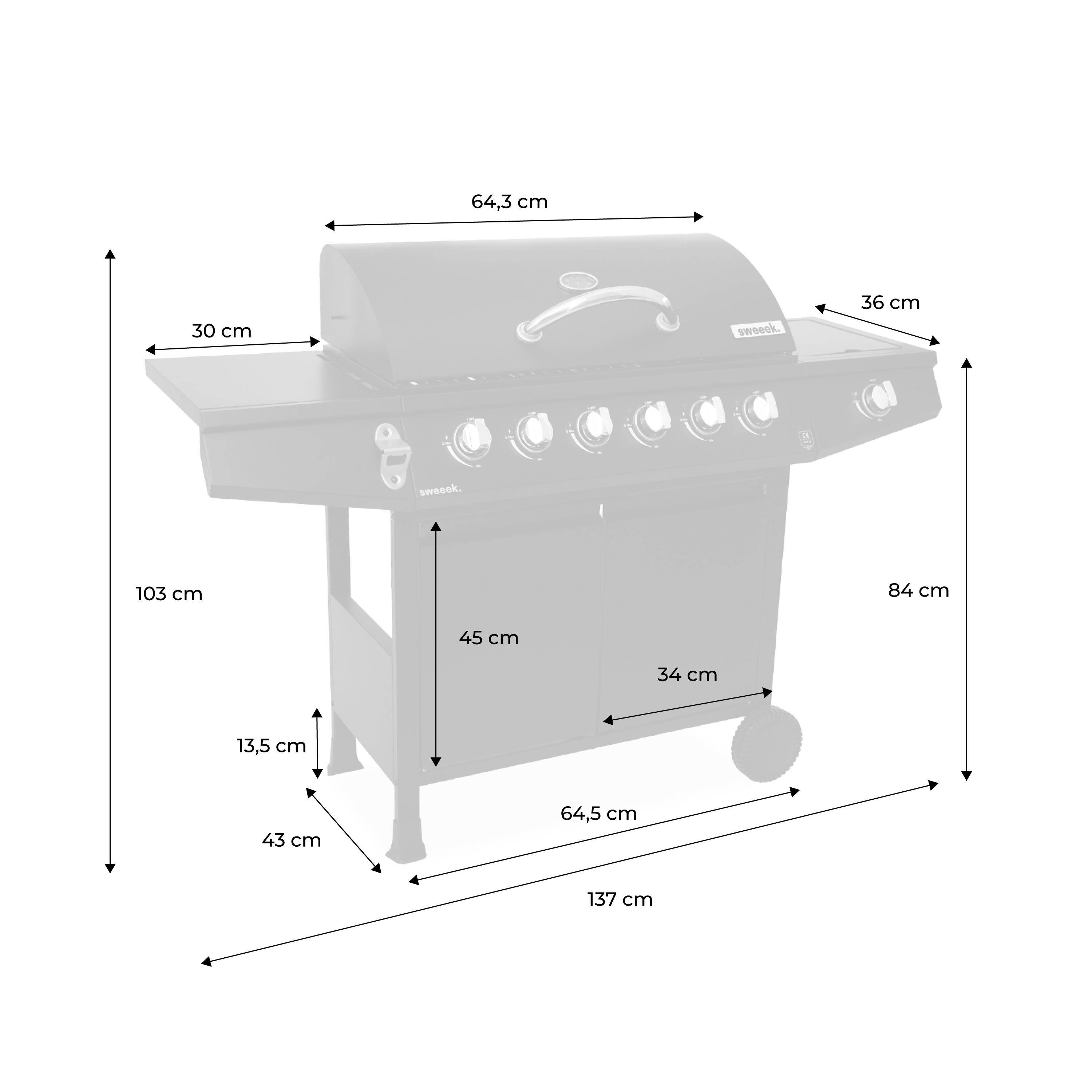 Bien pensada, la barbacoa Treville está equipada con dos estantes laterales que acogen alimentos o platos. Uno de los estantes tiene un quemador integrado que puede servir como calentador de platos. El otro dispone de un abrebotellas, muy práctico para abrir tus botellas. Es posible guardar condimentos y utensilios en el armario frontal. La bombona de gas también se aloja allí cuando no estás usando la barbacoa. El termómetro en la tapa permite vigilar la cocción sin abrir la tapa.