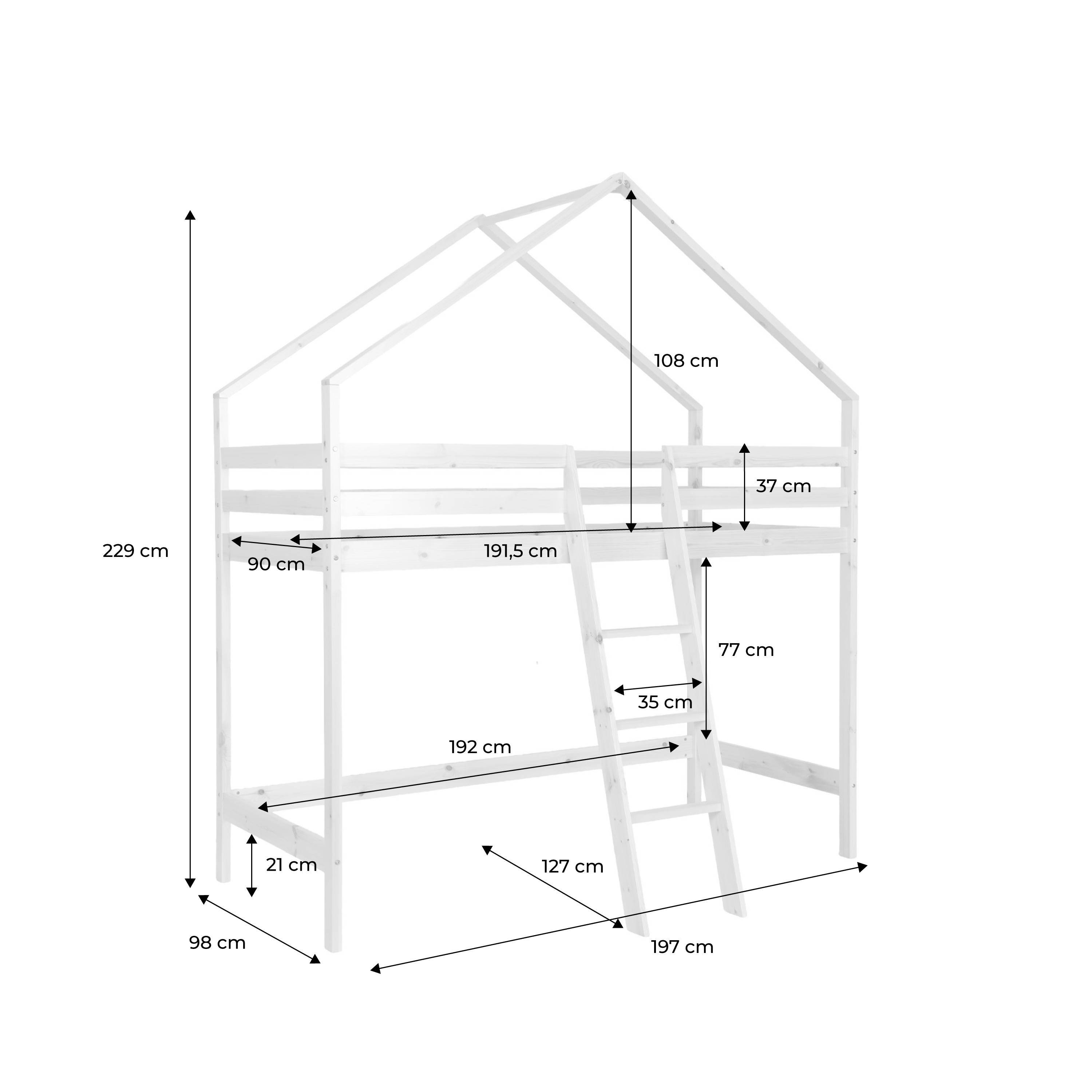 Cama infantil elevada cabaña de pino natural, 90cm